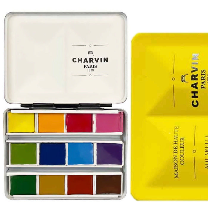 The watercolour set consists of 12 half pans, accompanied by its storage and travel pouch, allowing you to use the extra-fine CHARVIN watercolour at any time of the day. A true talisman for all your travels.