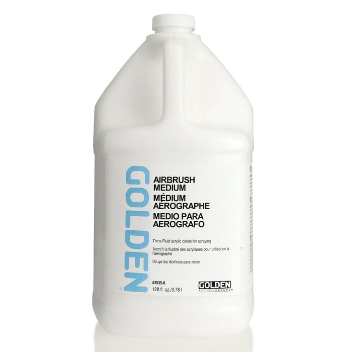 GOLDEN Airbrush Medium is a 100% acrylic-based medium designed to modify the GOLDEN Fluid Acrylics and other GOLDEN Acrylic products for airbrush and spray gun applications. While designed with the Fluid Acrylics in mind, GOLDEN Airbrush Medium also reduces the Heavy Body, SoFlat, Iridescent/Interference, and Fluorescent Acrylics for spray applications. GOLDEN Mediums and Gessoes can also be blended with Airbrush Medium for spraying. Airbrush Medium can be used for non-spraying mixtures to thin and slow down drying times.