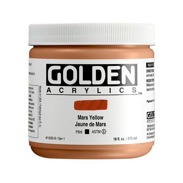 Experience the exceptionally smooth, buttery consistency of GOLDEN Heavy Body Mars Yellow Acrylic Paint. With no fillers or dyes added, this paint offers excellent permanency and lightfastness. Choose this paint for a matte finish with a higher pigment load or a glossier, transparent finish with a more reactive pigment. Reflect the qualities of your art with this premium paint.